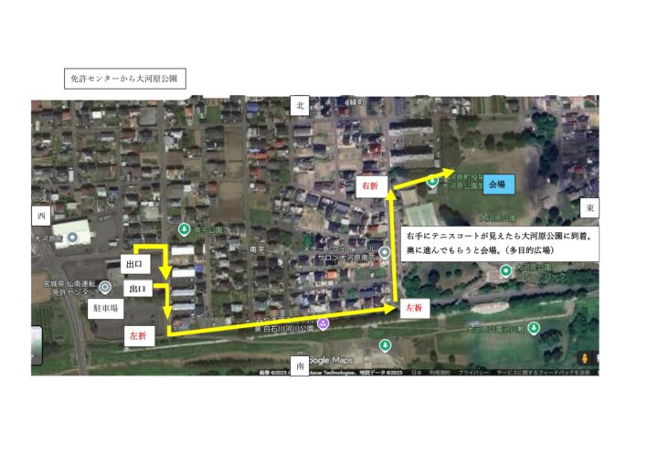 当日、参加者および来場者の皆様の駐車場は、白石川河川敷および免許センター駐車場となっております。