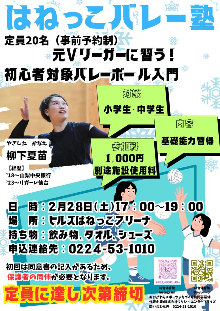 講師には、Vリーグでも活躍された栁下 夏苗(やぎした かなえ)さんをお迎えし、基礎から丁寧に指導いたします!